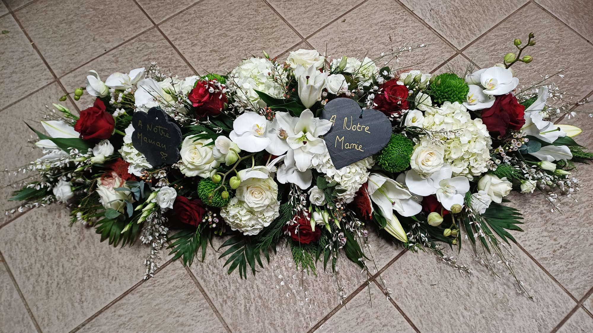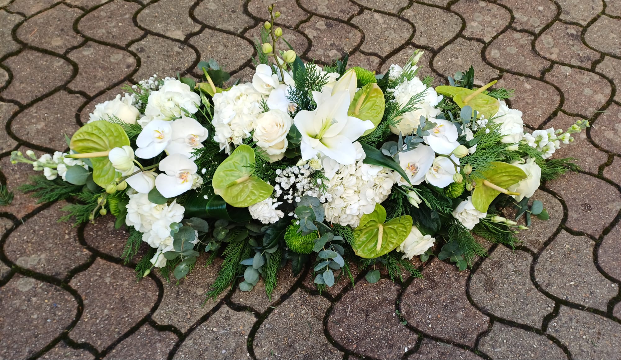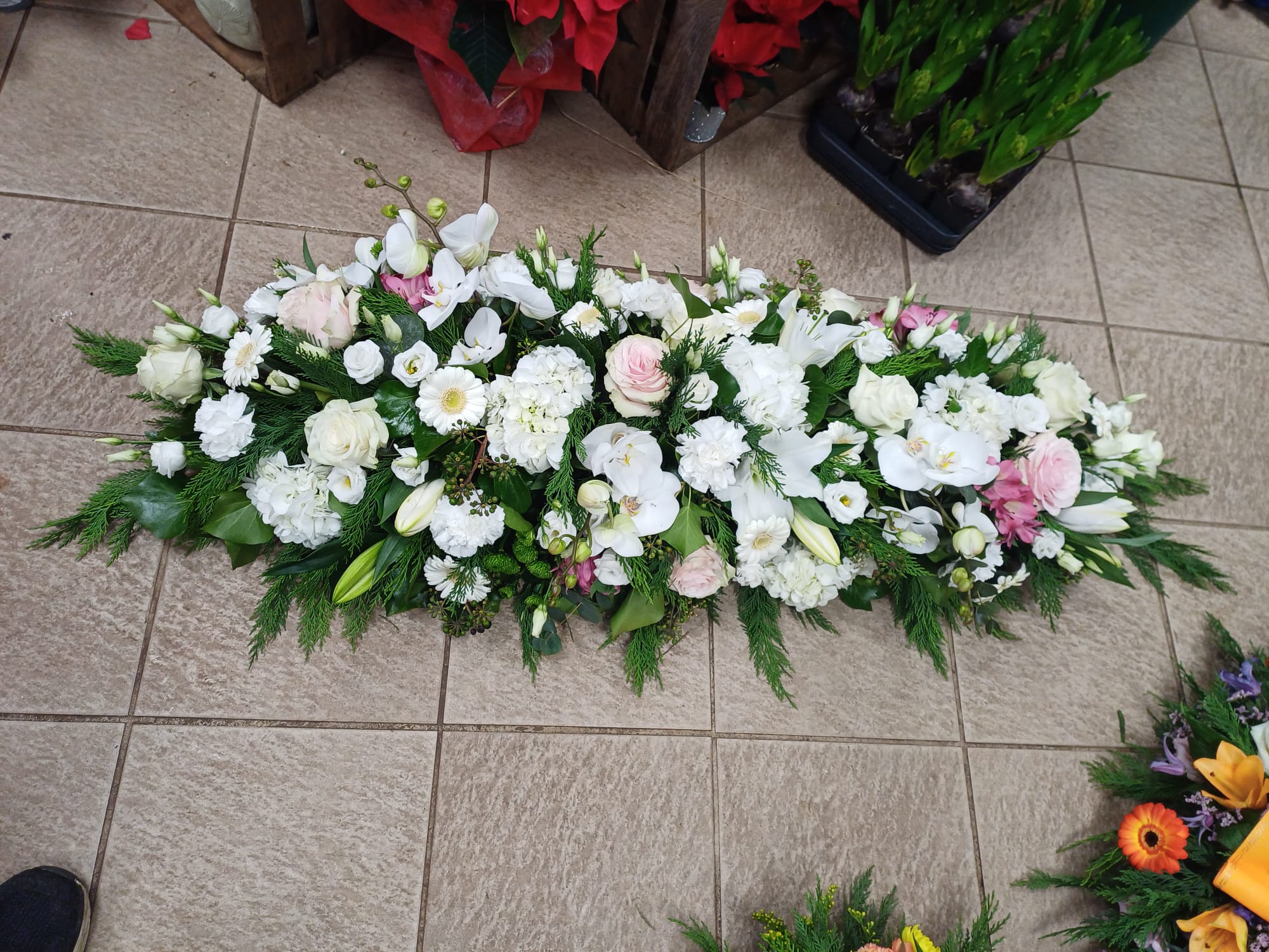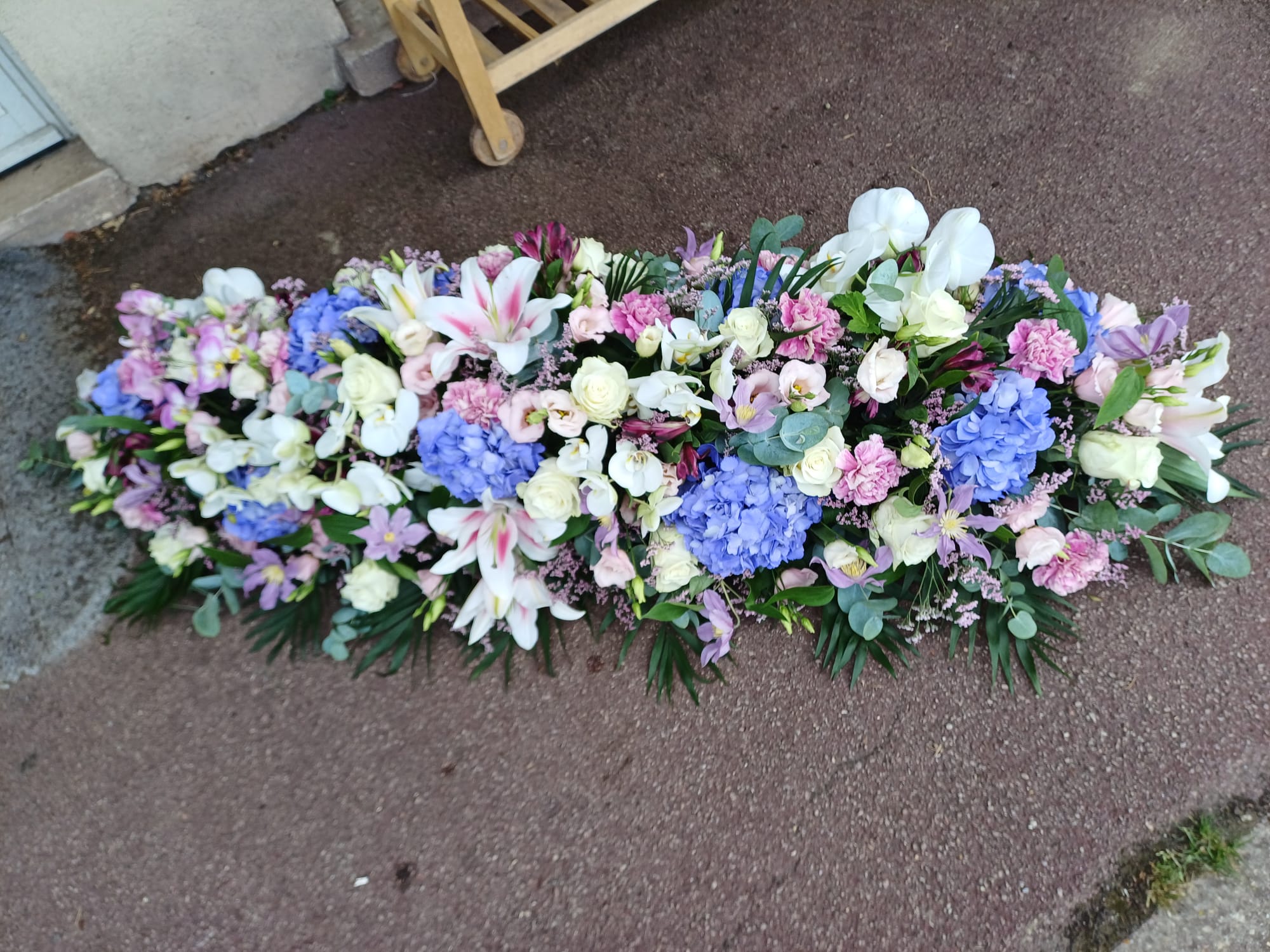 Cette pièce est la principale . Elle sera sur le cercueil. Il pourra être faite avec toutes les fleurs de saison et dans les couleurs de votre choix.